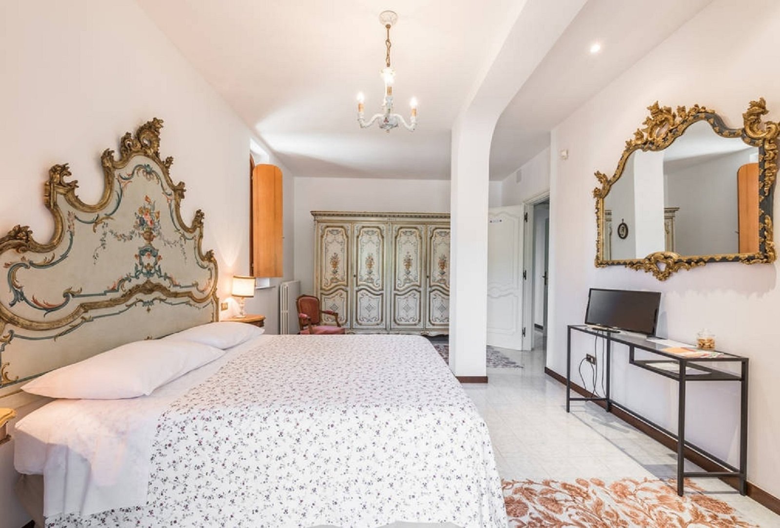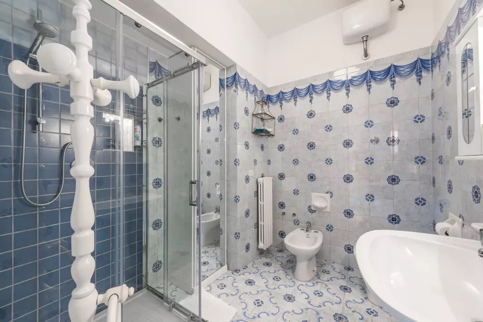 L’ambiente spazioso consente l’aggiunta di due letti singoli nella zona giorno. Ceramiche di Vietri e lampadari di Capodimonte.